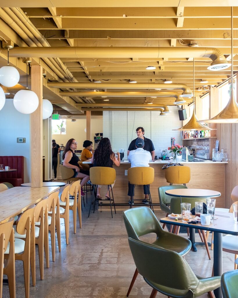 - Vibe: Simple, cheery design with a mid-century modern vibe, featuring frosted glass globe pendant lights and upholstered seating in earthy, muted tarragon, mustard, and burgundy tones. A long communal table anchors the center of the space. The outdoor patio offers ample, partially shaded seating.