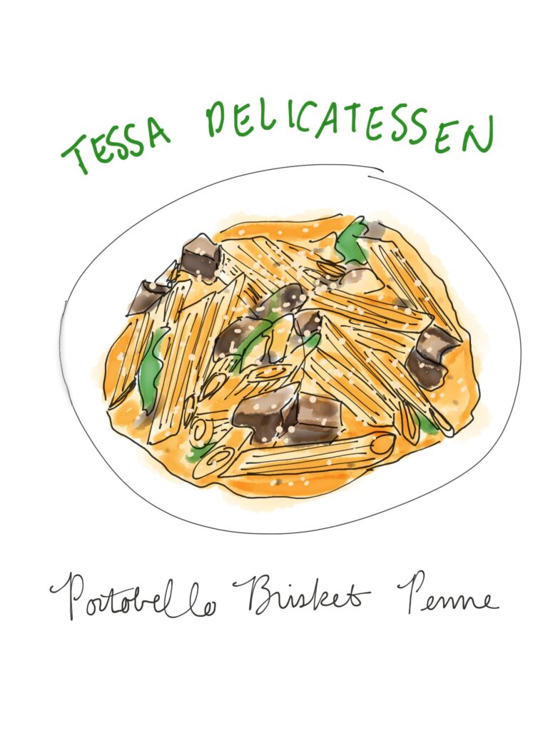 I picked up a plate of Portobello Brisket Penne from Tessa Delicatessen on E. Colfax the other day. This rib-sticking dish features generous strands of braised meat tossed in a creamy, vodka-adjacent sauce with a subtle kick from sweet chili, all topped with a sprinkle of Parmesan. There was so much sauce, meat, and mushrooms that I brought the leftovers home and added extra pasta to stretch it into a second meal.